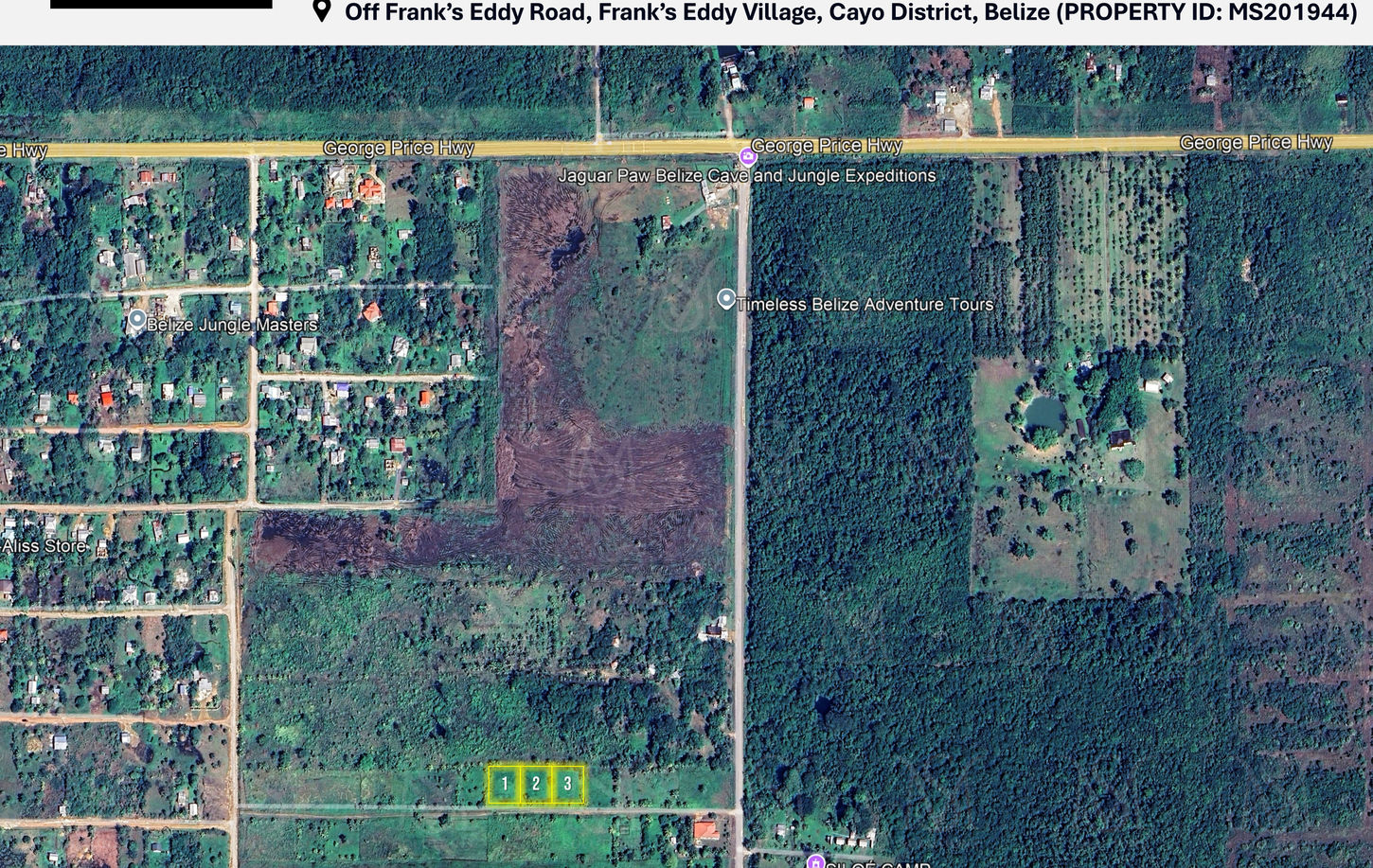 Take advantage of this excellent opportunity to own affordable ยผ acre parcels in this steadily growing community just off Frankโs Eddy Village, with quick and easy access to the George Price Highway. Each lot measures approximately 100 ft. x 100 ft., offering a generous, flat layout thatโs well-suited for building a comfortable home, vacation getaway, or rental property. These properties benefit from direct road access, ensuring convenience for construction and everyday living. The area is known for its natural surroundings, fresh air, and peaceful environment, while still being within reach of key destinations. Located near popular attractions like Jaguar Paw, the area continues to see increasing interest for both residential living and eco-tourism-related investments. Utilities are within reasonable proximity, and the neighborhood is gradually developing with a mix of homes, small farms, and retreats; making it a smart choice for buyers seeking both lifestyle and long-term value. Its location also allows for easy commutes toward Belmopan or Belize City, adding to its practicality. Whether you're looking to build now or invest for the future, these competitively priced lots at USD $25,000 per lot present a rare chance to secure land in a promising and accessible area.